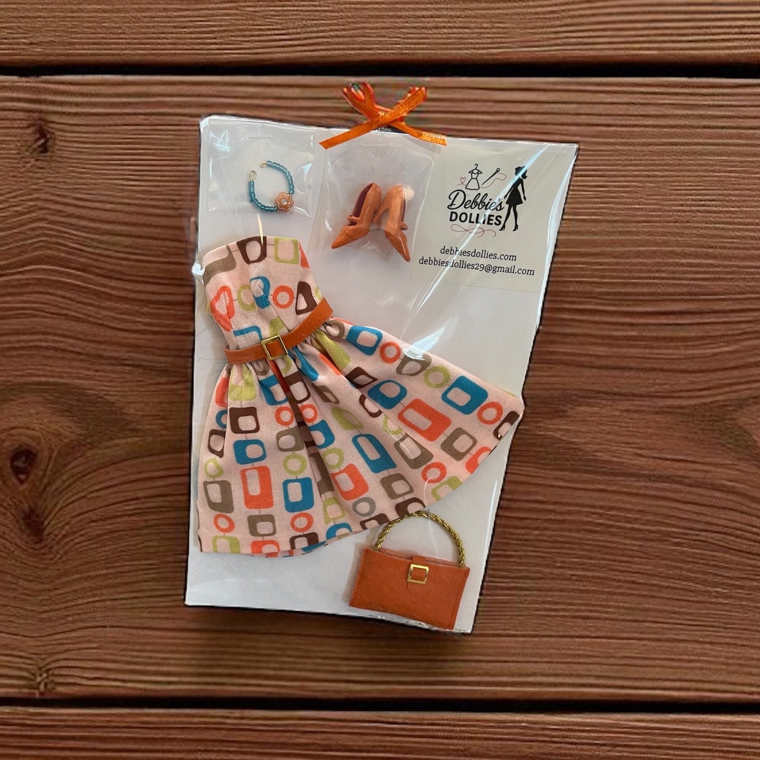Barbie sets the pace in this vintage 60's style dress, which come complete with shoes, belt, purse and necklace. The dress is fully lined with hidden seams. Other fabrics are available.