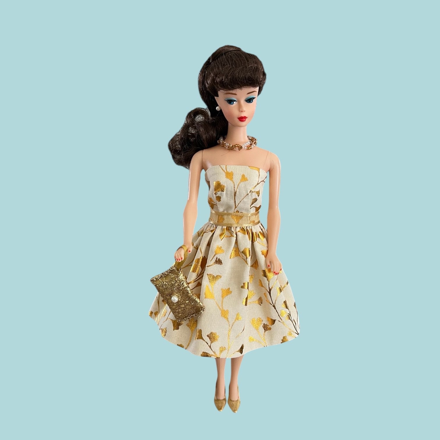 Barbie is always brilliant in this lovely vintage style Golden Glamour strapless dress which includes belt, shoes, purse, and necklace. This dress is fully lined with hidden seams.