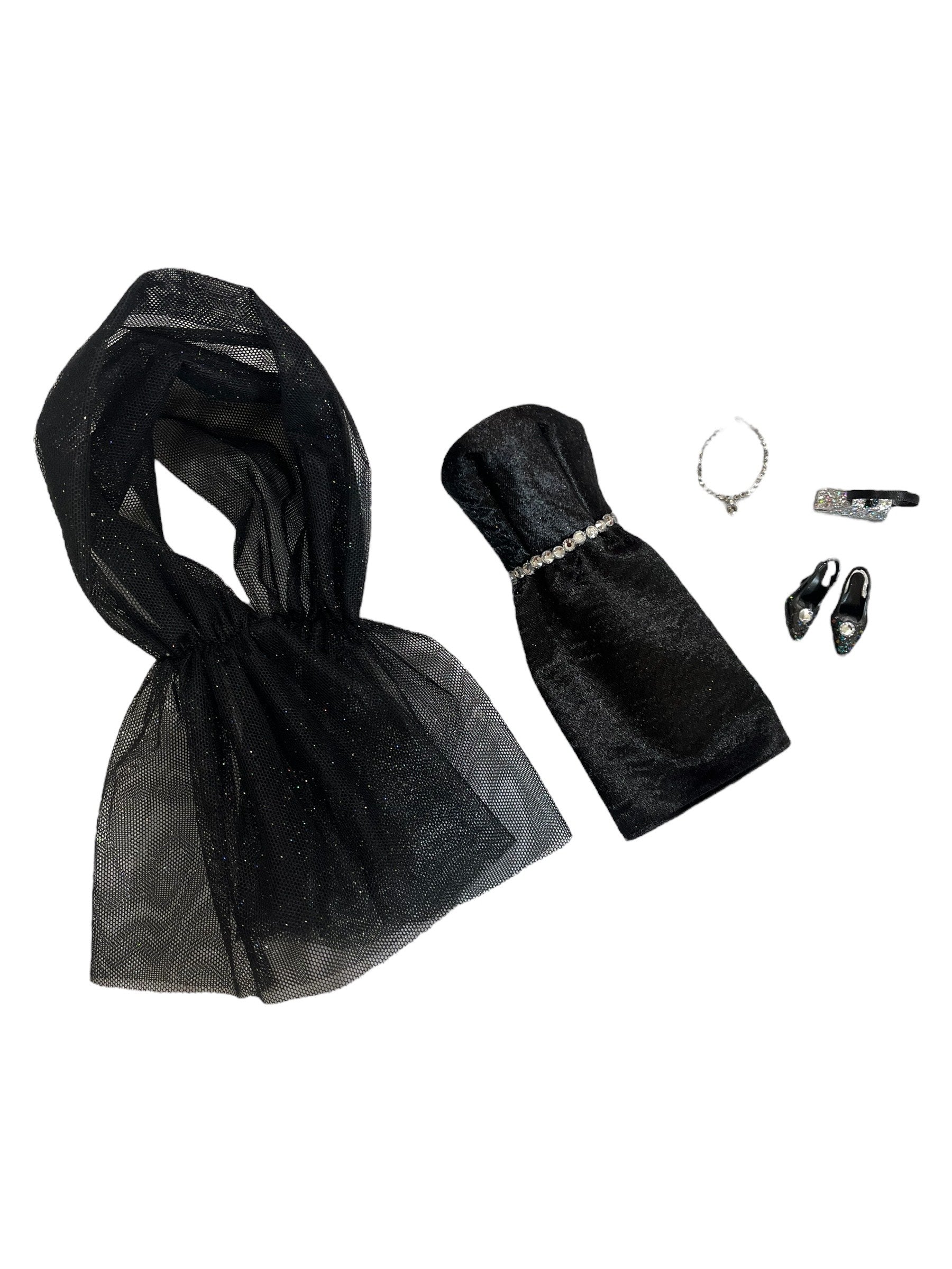 Paying homage to the iconic Black Magic, Barbie loves to kick up her heels in this lovely vintage style Magic Evening dress which includes wrap, shoes, purse, and necklace. This elegant dress is fully lined with hidden seams.