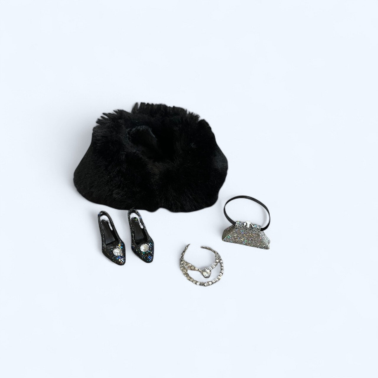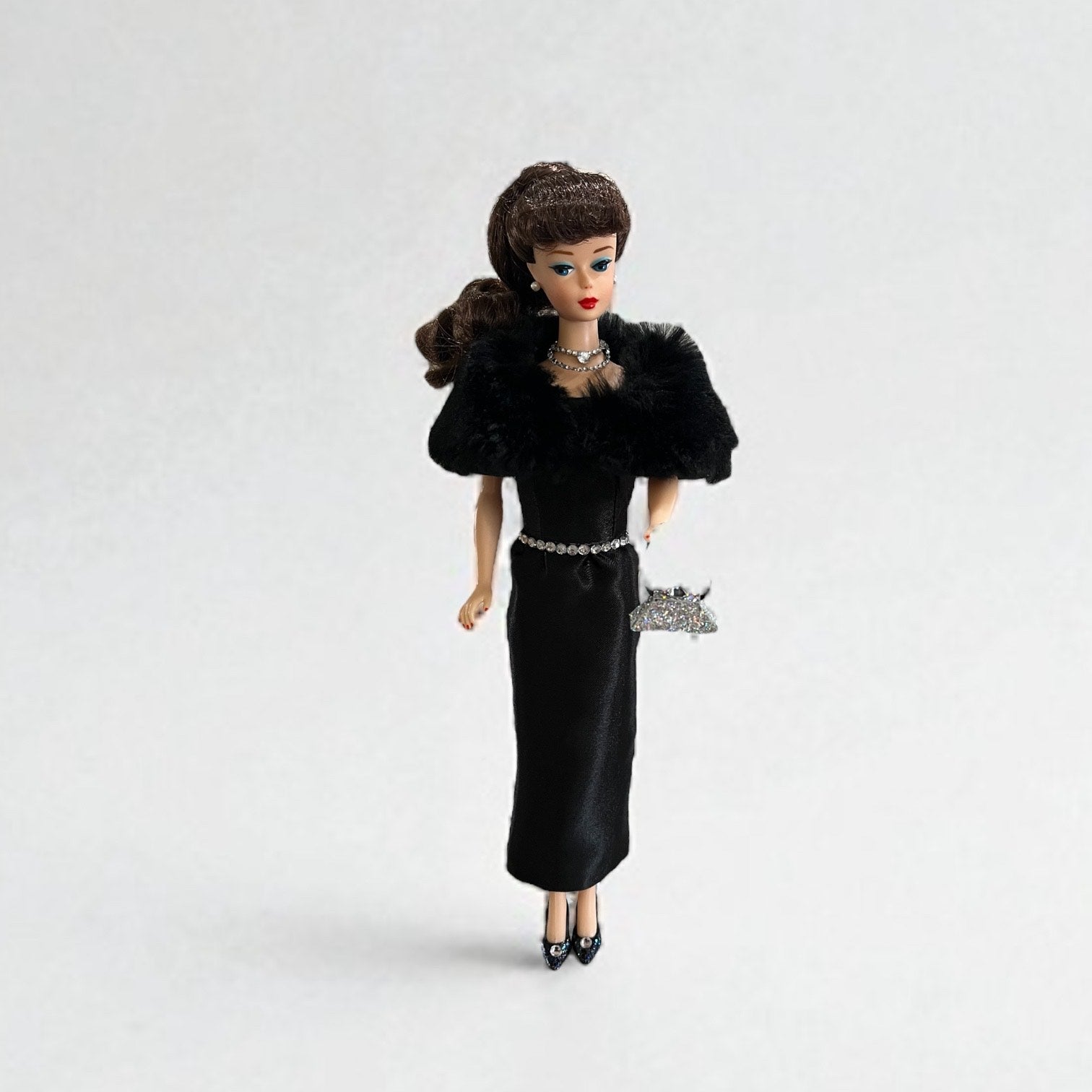 Barbie loves to kick up her heels in this lovely vintage style Midnight Magic dress which includes fur stole, shoes, purse, and necklace. This elegant dress is fully lined with hidden seams.