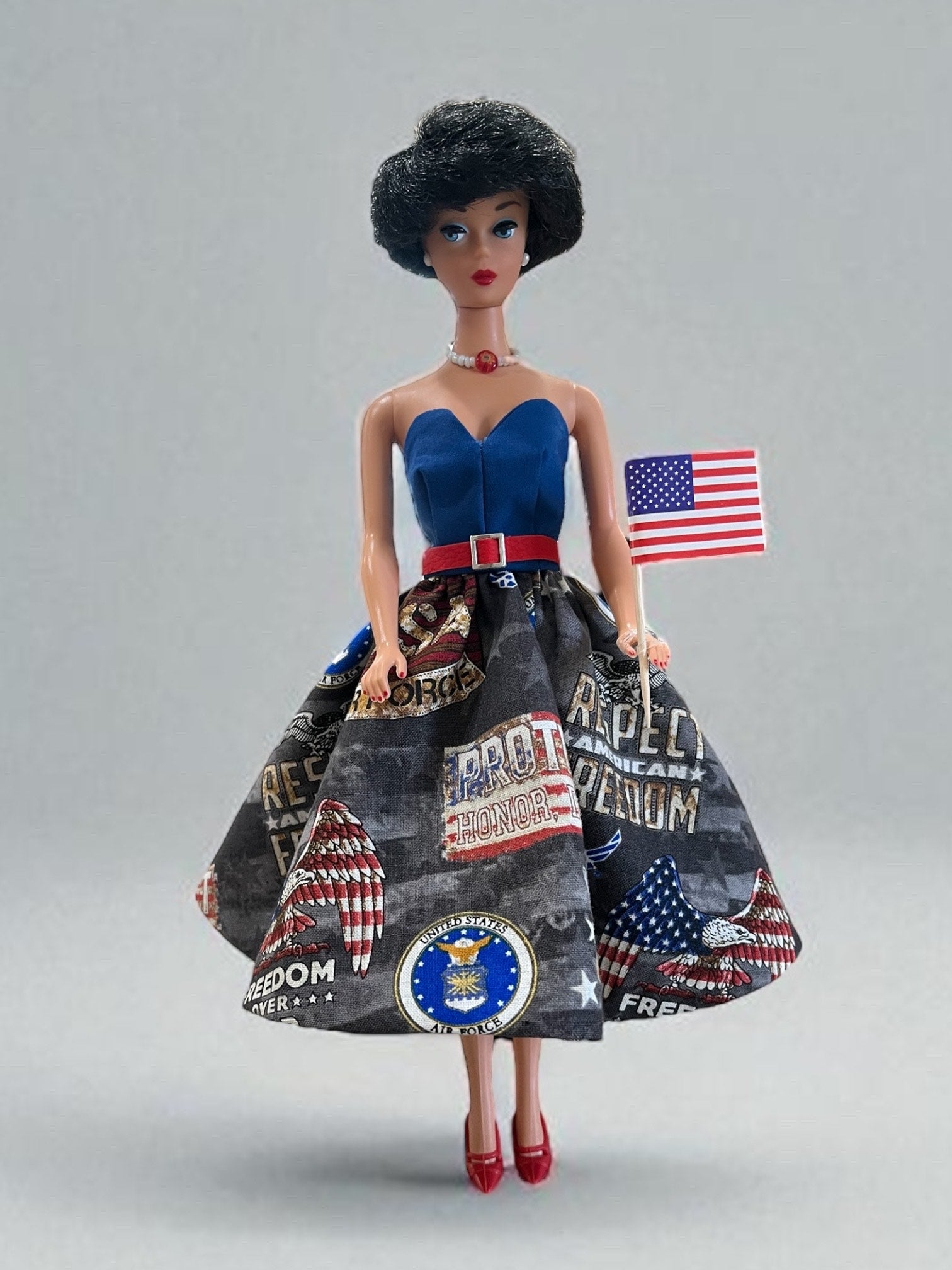 Barbie honors all US Military forces. Here she is featured in her vintage style Salute to the Air Force dress, which is fully lined with hidden seams. Ken is sure to know that his service was appreciated and he is welcome back home when he sees Barbie in this Patriotic dress. Dress includes shoes, belt, US flags and necklace.