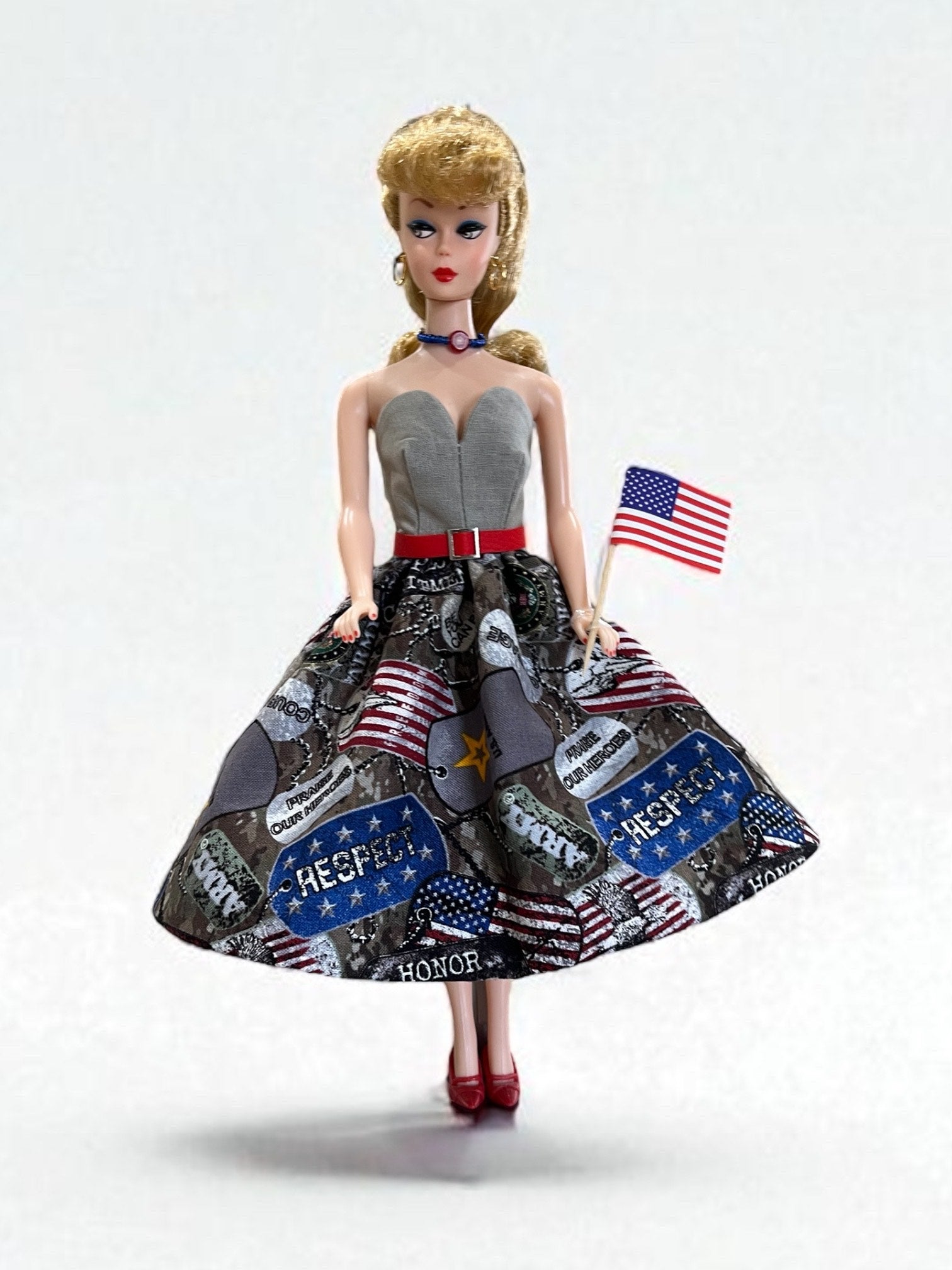 Barbie honors all US Military forces. Here she is featured in her vintage style Salute to the Army dress, which is fully lined with hidden seams. Ken is sure to know that his service was appreciated and he is welcome back home when he sees Barbie in this Patriotic dress. Dress includes shoes, belt, US flags and necklace.