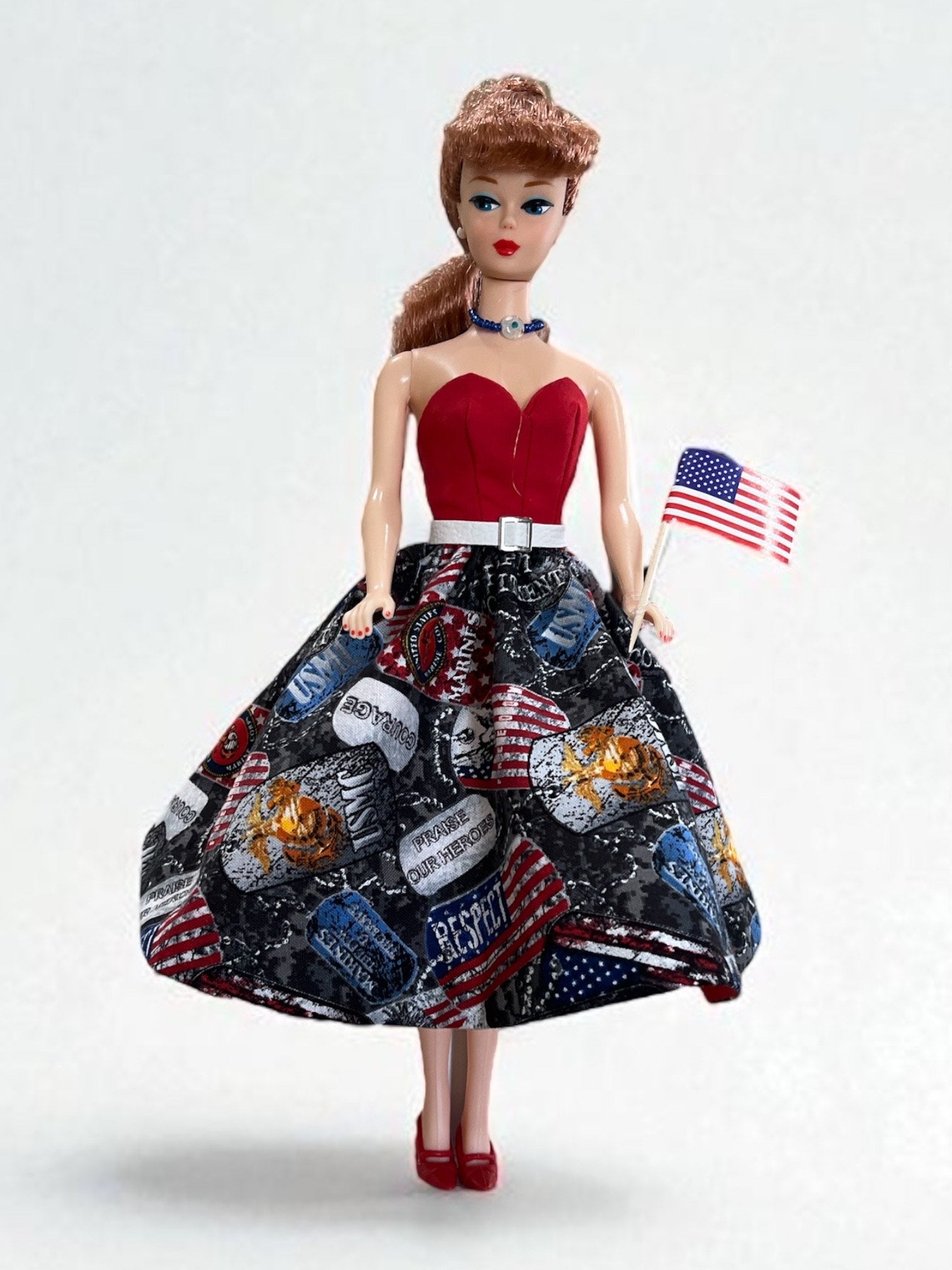 Barbie honors all US Military forces. Here she is featured in her vintage style Salute to the Marine Corps dress, which is fully lined with hidden seams. Ken is sure to know that his service was appreciated and he is welcome back home when he sees Barbie in this Patriotic dress. Dress includes shoes, belt, US flags and necklace.