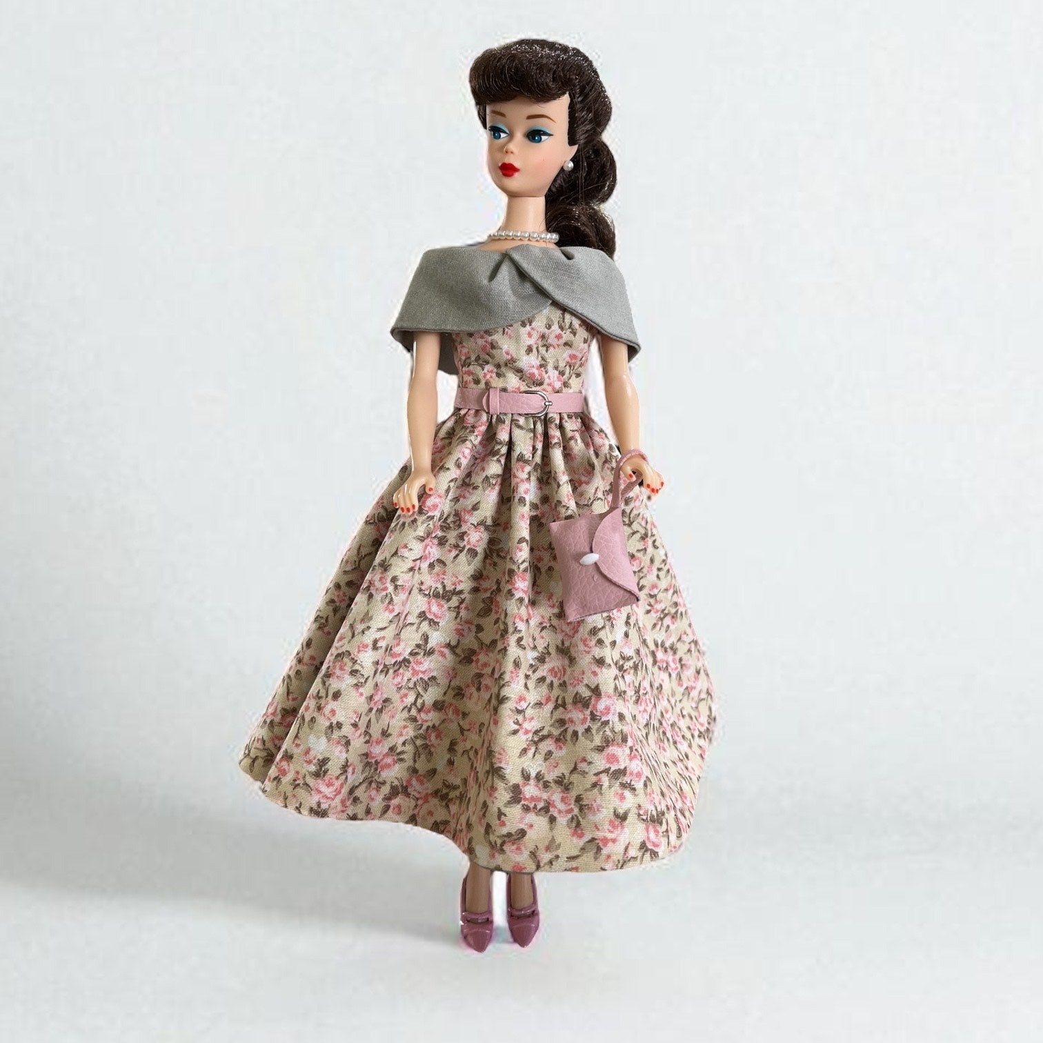 Barbie loves to have fun around town while looking beautiful in her vintage style Spring Fling dress. Hand sewn dress includes belt, shoes, purse, and necklace. This lovely dress is fully lined with hidden seams.