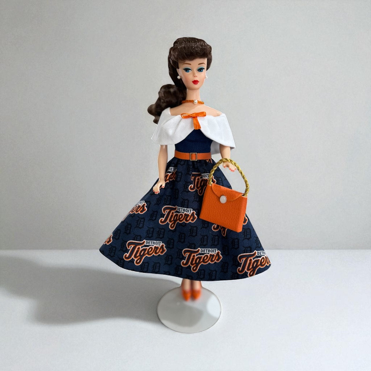 Go Tigers! The team is sure win with Barbie cheering them on in this fully lined and accessorized vintage style dress! Please allow 4 to 6 weeks for delivery.