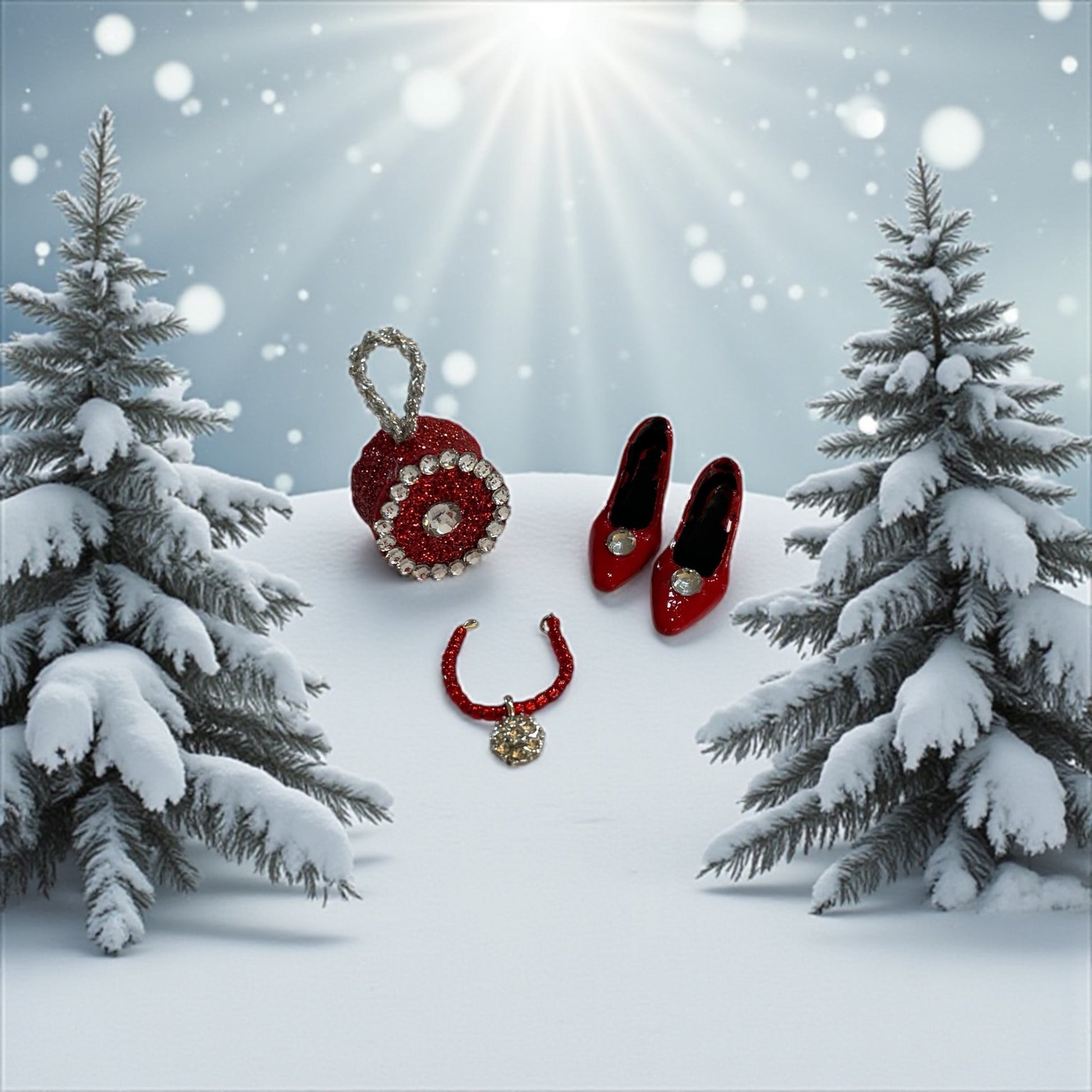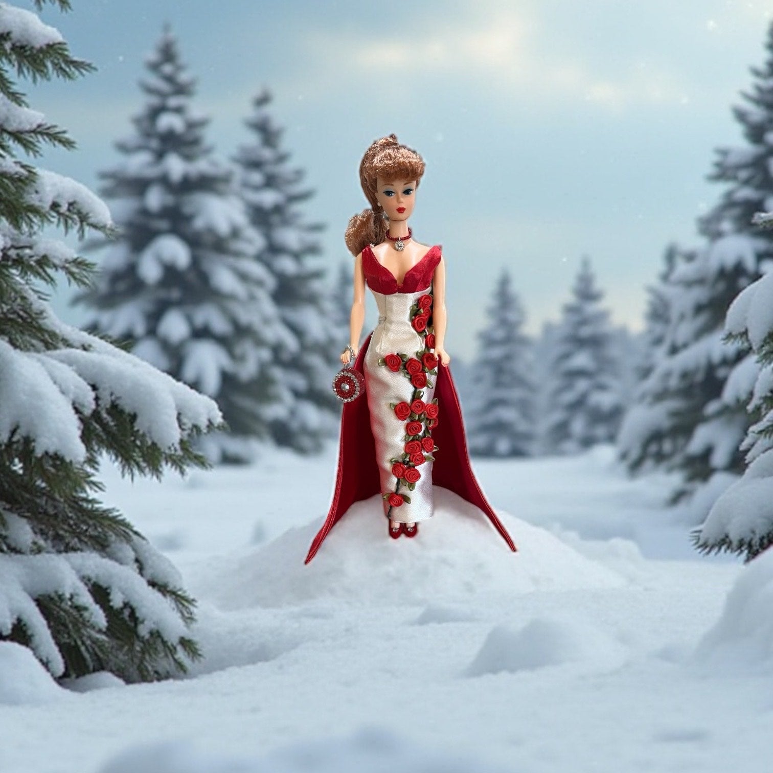 Barbie is ready for Christmas or Valentines Day in this lovely vintage style satin dress which includes shoes, purse, and necklace. This dress is fully lined with hidden seams. Individual ribbon roses are hand-sewn onto the hand embroidered vines. The red satin train is detachable.