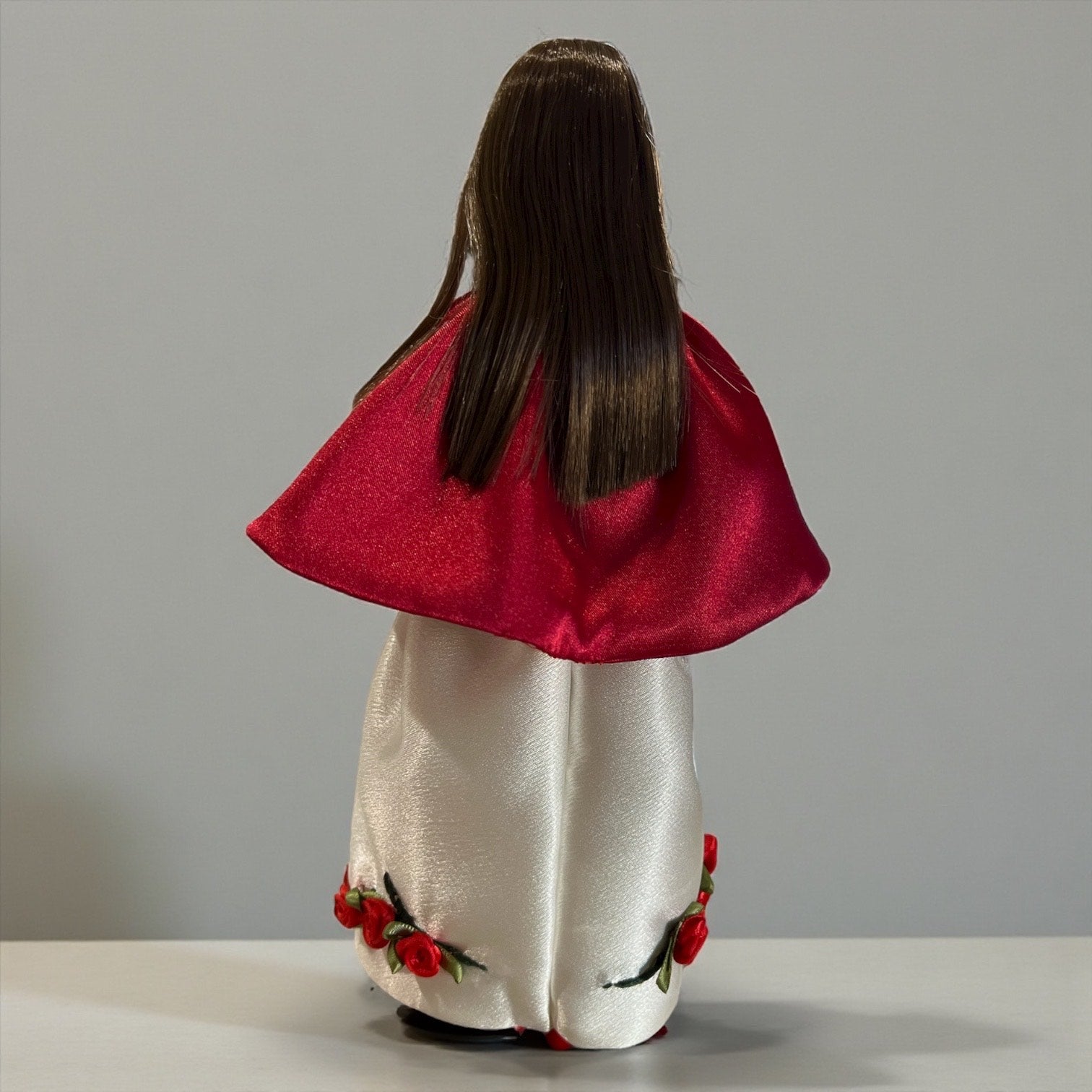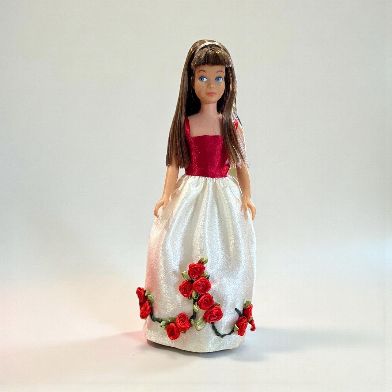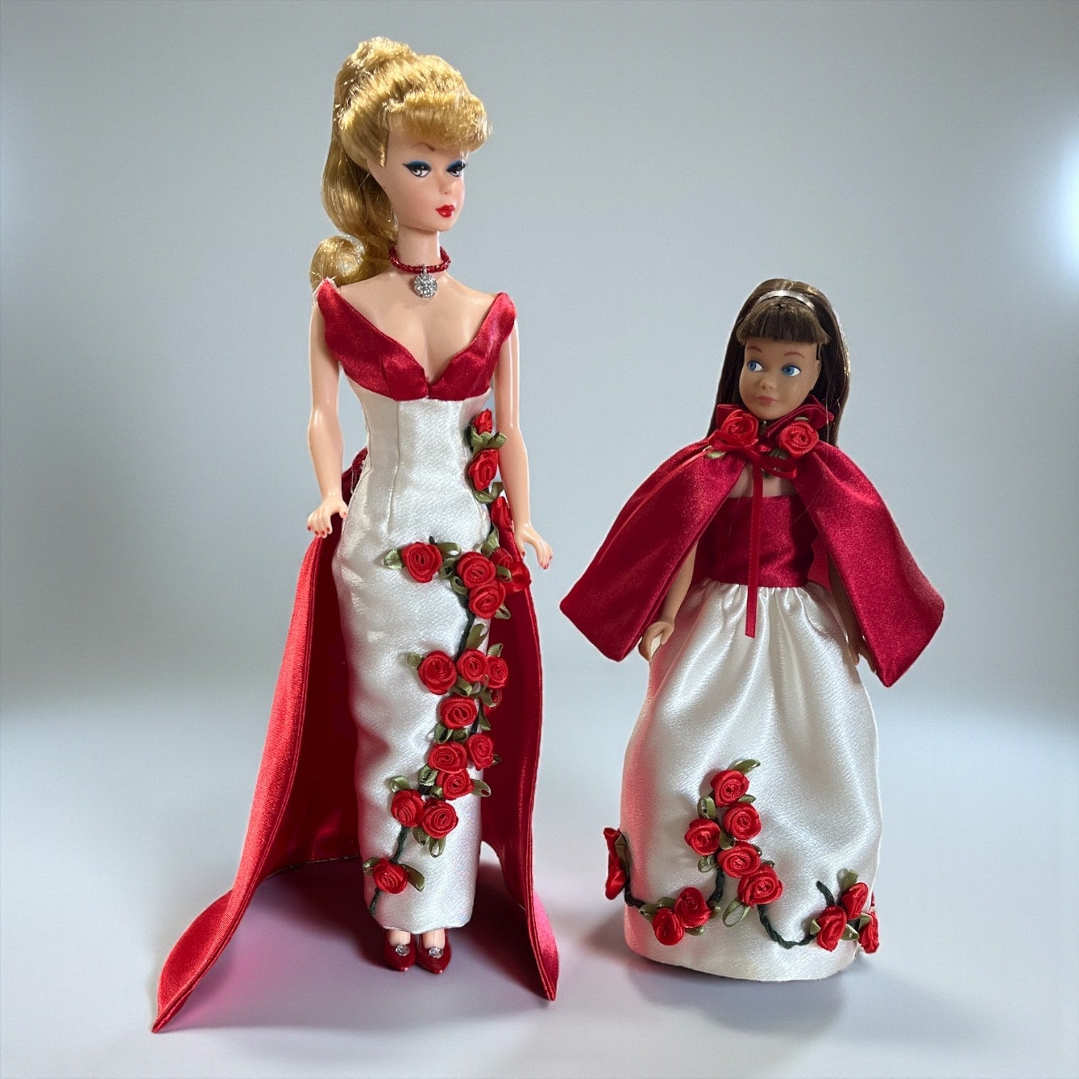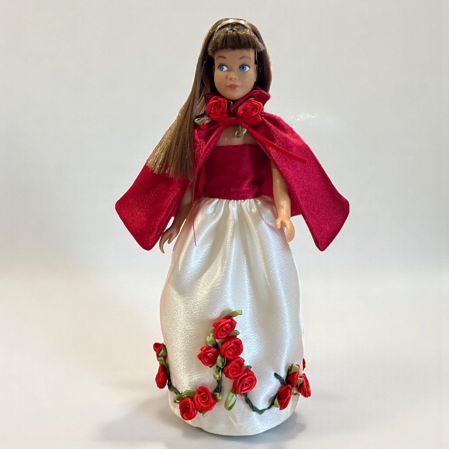 Skipper is ready for Christmas or Valentines Day in this lovely vintage style satin dress that matches the Barbie Winter Rose dress. This dress is fully lined with hidden seams. Individual ribbon roses are hand-sewn onto the hand embroidered vines. The red satin cape is detachable. Barbie's dress is sold separately.